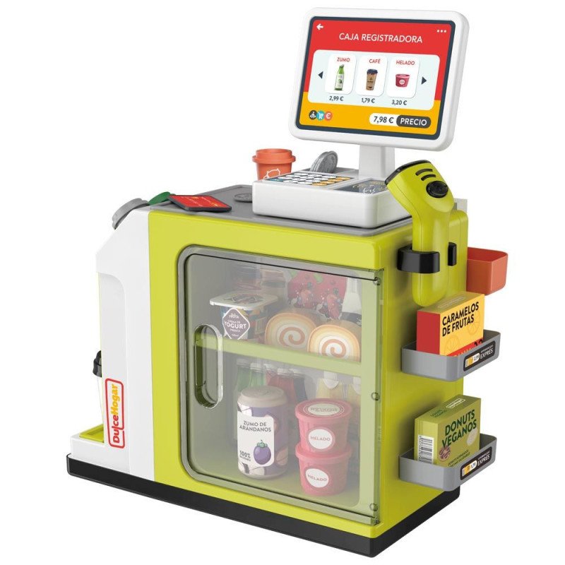 Supermercado con cafetera, nevera y más de 20 envases de alimentos variados. Incluye escáner, caja registradora, monedas y billetes. Permite a los niños y niñas familiarizarse con el manejo del dinero, las compras y las ventas, desarrollando la imaginación y favoreciendo el juego compartido.